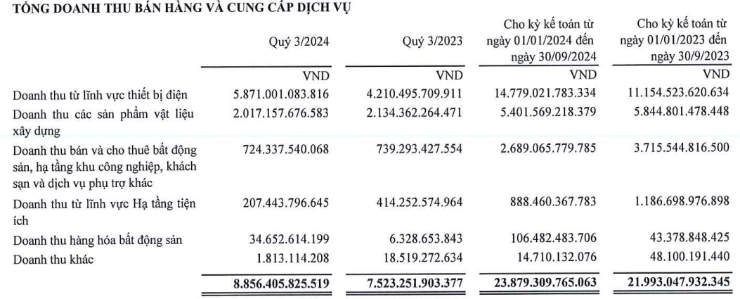 Tương tự, doanh thu mảng khu công nghiệp và bất động sản cũng giảm nhẹ so với quý III năm ngoái, đạt 759 tỷ đồng. Theo đánh giá của GELEX, đây vẫn là lĩnh vực được đánh giá giàu tiềm năng khi các dự án do Viglacera (đơn vị thành viên của GELEX) đầu tư thu hút dòng vốn chất lượng.