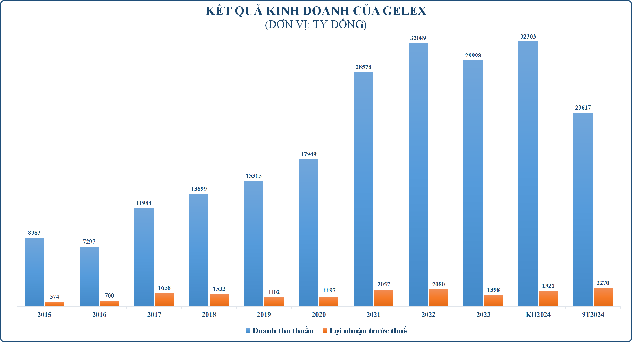 Lũy kế 9 tháng năm 2024, GELEX ghi nhận 23.617 tỷ đồng doanh thu thuần, tăng 7,8% so với cùng kỳ, lợi nhuận trước thuế và sau thuế lần lượt đạt 2.270 tỷ đồng và 1.653 tỷ đồng, tương ứng tăng 63,5% và 75,1% so với 9 tháng đầu năm 2023.