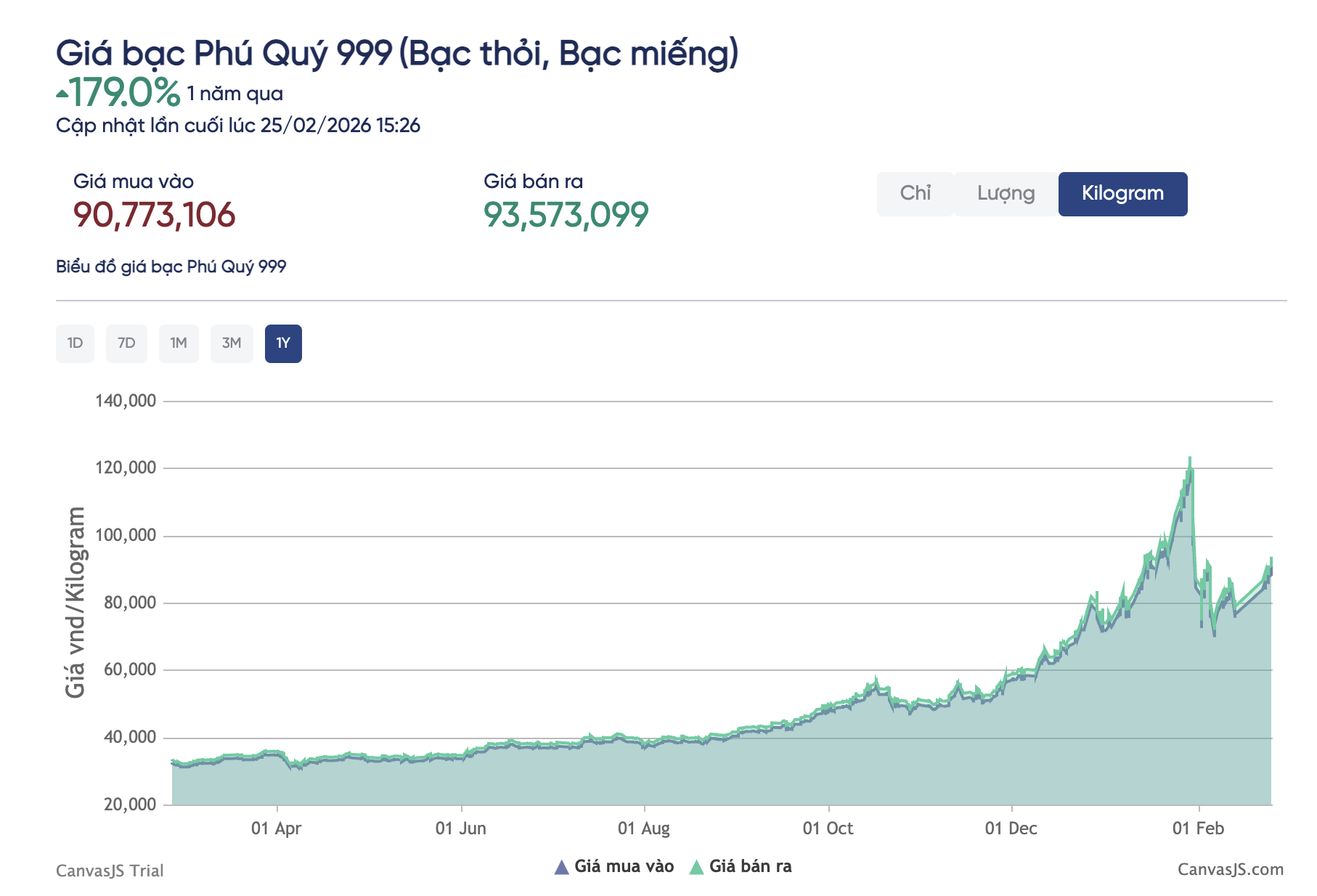 Giá bạc thế giới đang tăng mạnh, giao dịch trên 91 USD/ounce, tương đương mức tăng hơn 4%. Thị trường bạc trong nước, 15h30 chiều 25/2, Tập đoàn Phú Quý niêm yết giá bạc miếng mua vào, bán ra 3,404 triệu đồng/lượng và 3,509 triệu đồng/lượng, giá bạc thỏi Phú Quý mua vào, bán ra 90,773 triệu đồng/kg và 93,573 triệu đồng/kg.