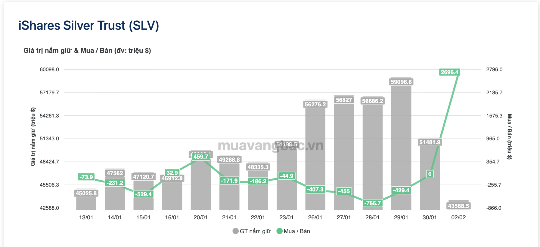 Theo dữ liệu muavangbac.vn, quỹ bạc lớn nhất thế giới iShare Silver Trust (SLV) vừa chi gần 3 tỷ USD để mua khoảng 500 tấn bạc trong ngày 2/2, xác lập kỷ lục về giá trị giao dịch trong ngày. Con số này tương đương với tổng giá trị mà quỹ bán ra từ đầu năm.