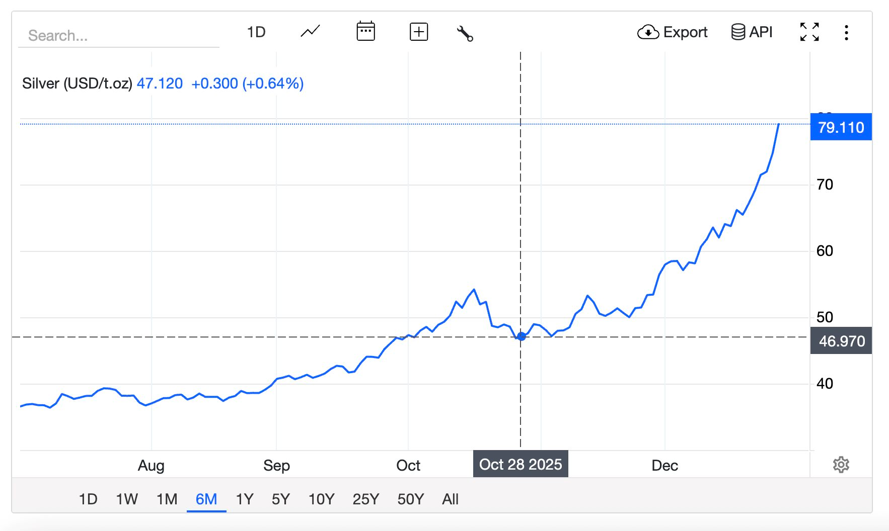 Giá bạc hiện đang được giao dịch gần mức 80 USD/ounce sau khi các biện pháp hạn chế xuất khẩu của Trung Quốc và nhu cầu tăng quá nóng gây ra tình trạng thiếu hụt nguồn cung toàn cầu. Tính tới tối 28/12 theo giờ Hà Nội, bạc thế giới có giá 79,15 USD/ounce, tăng từ mức 55 USD/ounce của ngày 28/11, từ 1 tháng trước. Trong ngày 28/10, bạc cũng mới có giá 46,9 USD/ounce.