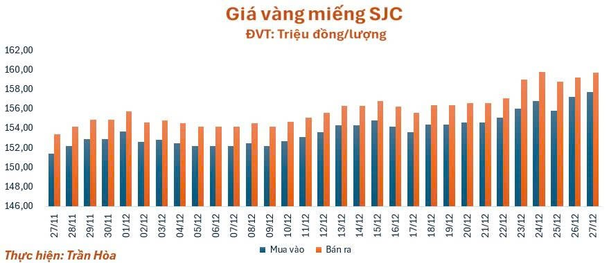 Phiên giao dịch sáng 27/12, giá vàng miếng SJC, Bảo Tín Minh Châu, Doji và PNJ đồng loạt tăng 0,5 triệu đồng/lượng so với giá khảo sát sáng qua, đạt mức 157,7 – 159,7 triệu đồng/lượng (mua – bán), chênh lệch hai chiều ở ngưỡng 2 triệu đồng/lượng.