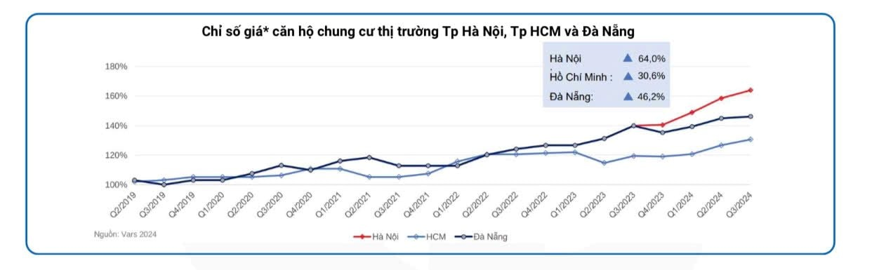 Theo sau là Đà Nẵng với mức tăng so với kỳ gốc đạt 49,9%. Trong khi TP.HCM chứng kiến mức tăng chậm hơn, khoảng 34,3% so với kỳ gốc khi thị trường mới bắt đầu ghi nhận các dự án mở bán từ quý III/2024.