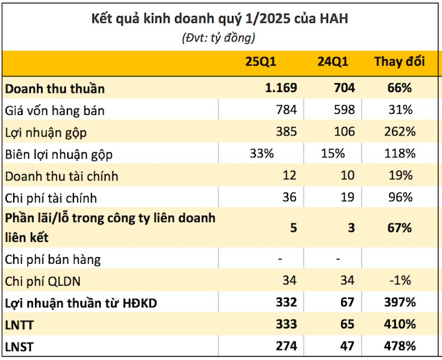 Theo đó, doanh thu thuần của HAH đạt 1.169 tỷ đồng, tăng trưởng 66% so với cùng kỳ. Chi phí giá vốn tăng 31% ít hơn mức tăng doanh thu giúp lợi nhuận gộp cao gấp gần 4 lần cùng kỳ, đạt gần 385 tỷ đồng. Biên lợi nhuận gộp cũng được cải thiện từ mức 15% lên 33% trong quý 1/2025.