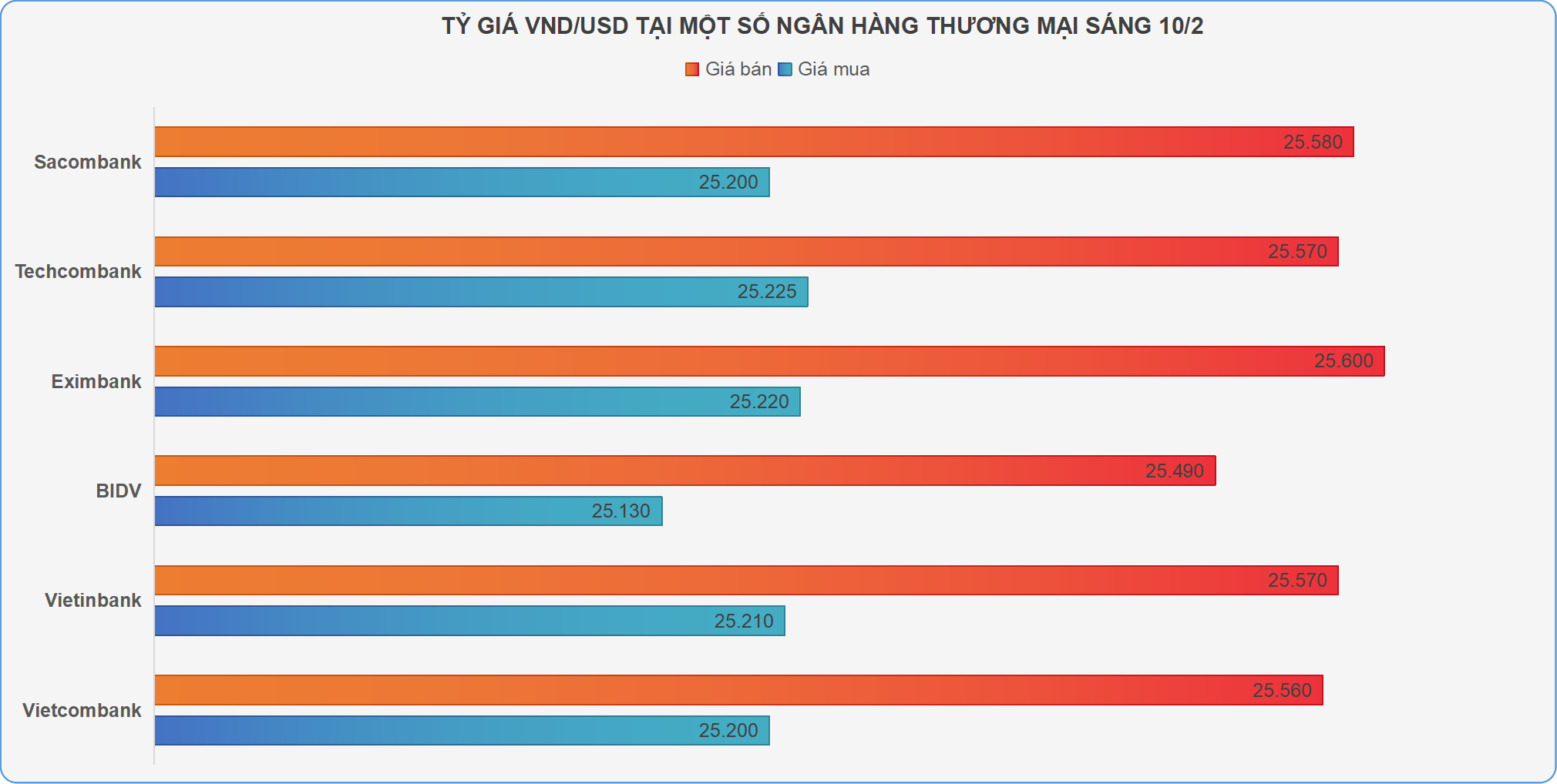 Eximbank giá USD tăng 60 đồng ở chiều mua và 70 đồng ở chiều bán so với phiên trước, hiện đang niêm yết USD ở mức 25.220 - 25.600 VND/USD. Trong khi Techcombank giá USD điều chỉnh tăng 60 đồng ở hai chiều mua và bán, đang niêm yết ở mức 25.225 - 25.570 VND/USD.