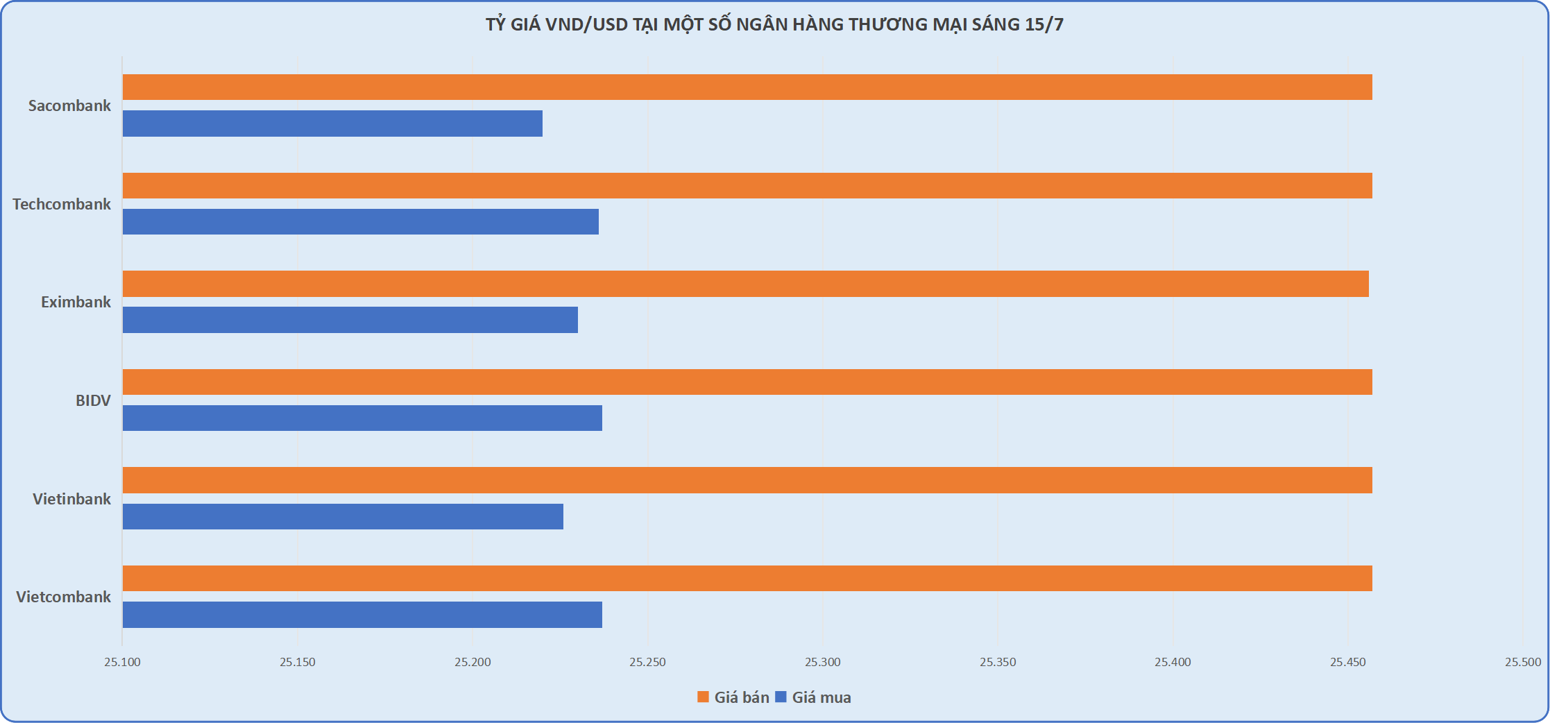 Techcombank đang niêm yết USD ở mức 25.236 - 25.457 VND/USD, tăng 6 đồng ở chiều mua và giảm 3 đồng ở chiều bán. Trong khi đó Sacombank đang niêm yết USD ở mức 25.220 - 25.457 VND/USD, giảm 10 đồng chiều mua và 3 đồng ở chiều bán so với phiên khảo sát liền trước.