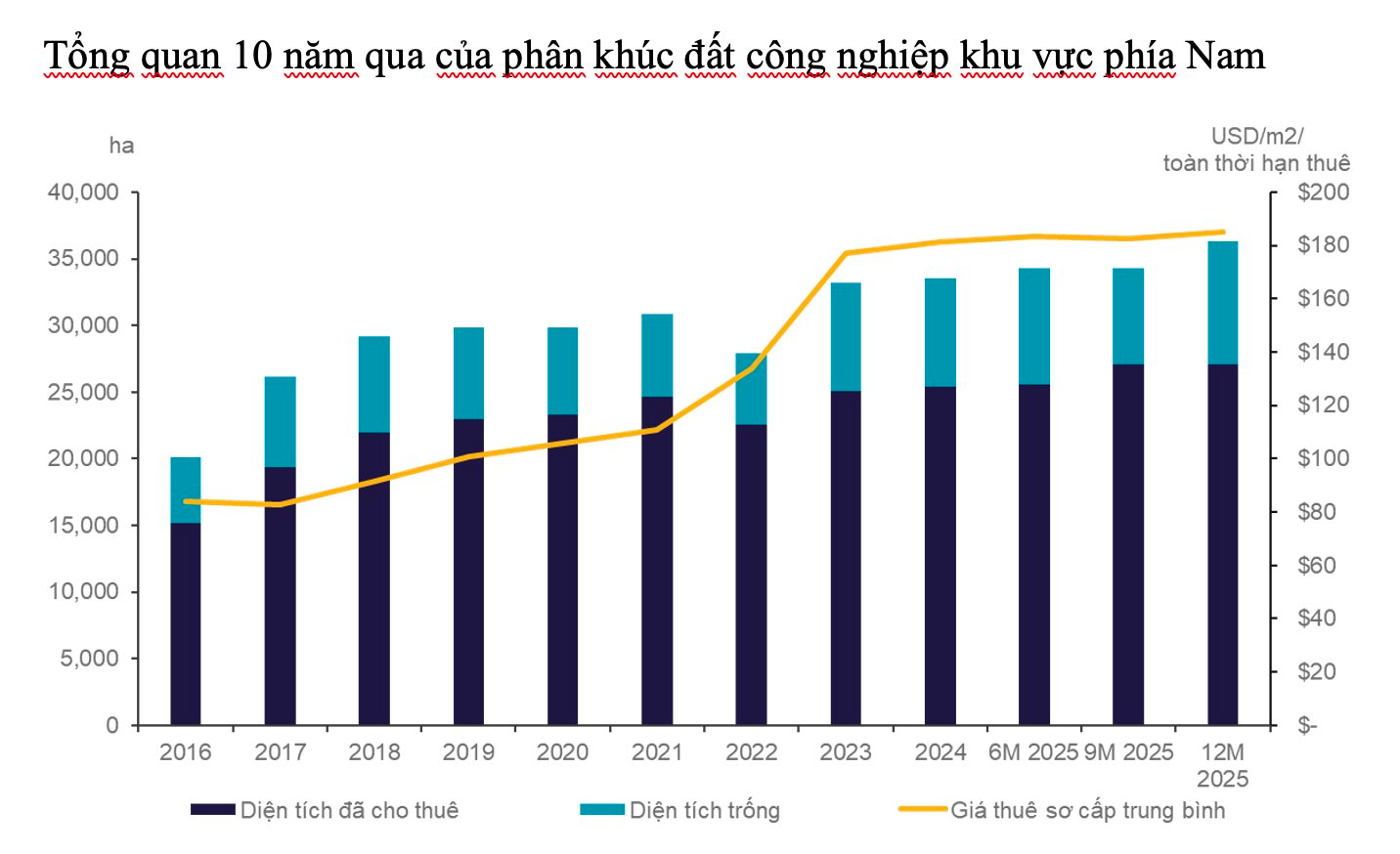 Trong 10 năm qua, thị trường đất khu công nghiệp tại miền Nam ghi nhận tổng nguồn cung tăng 80,21%, trong khi giá sơ cấp trung bình tăng 120,5%, tương đương tốc độ tăng trưởng kép hàng năm (CAGR) đạt 9,18% trong giai đoạn này. Ở phân khúc tài sản xây sẵn, nhà kho xây sẵn (RBW) ghi nhận tổng nguồn cung tăng 141% trong giai đoạn nhìn lại, trong khi giá thuê tăng 43,8%, tương đương CAGR 5,3%. Nhà xưởng xây sẵn (RBF) ghi nhận nguồn cung tăng 134%, với giá thuê tăng 16,7%, tương đương CAGR 2,2%.
