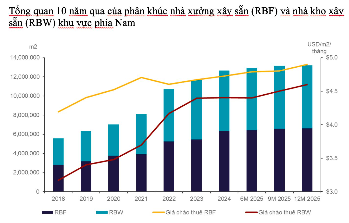 Tại miền Nam, nhu cầu đó đã thúc đẩy sự hình thành các cụm công nghiệp sâu hơn và một cấu trúc tăng trưởng vùng rõ nét hơn. Trong phạm vi Vùng kinh tế trọng điểm phía Nam (theo định nghĩa của Cushman & Wakefield, bao gồm TP.HCM, Tây Ninh và Đồng Nai), tổng nguồn cung đất khu công nghiệp hiện đạt 36.400 ha tại 161 dự án. Khu vực này hiện cũng có khoảng 6,60 triệu m² diện tích nhà xưởng xây sẵn (RBF) tại 205 dự án và 6,65 triệu m² diện tích nhà kho xây sẵn (RBW) tại 189 dự án.