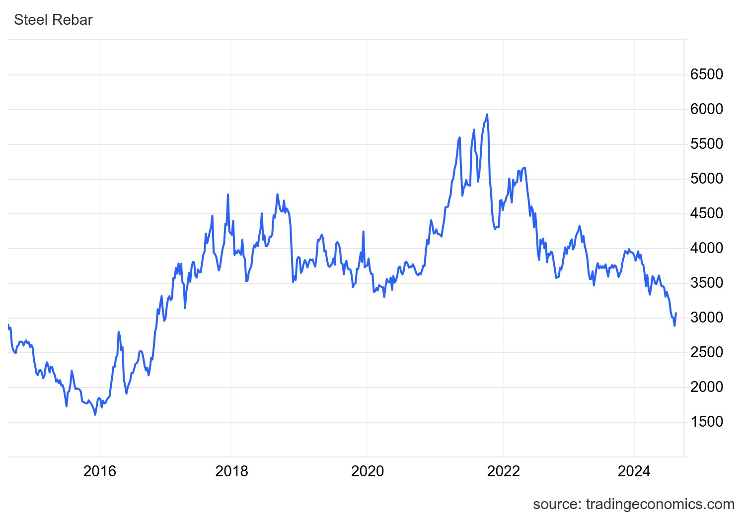 Sự suy thoái kinh tế của Trung Quốc đã khiến nhu cầu về nhà ở mới giảm mạnh trong những năm qua, được nhấn mạnh bởi mức giảm hàng năm nhanh nhất về giá nhà kể từ năm 2015 trong tháng 7. Tình trạng dư cung nhà ở trên diện rộng đã khiến chính phủ Trung Quốc phải kiềm chế hỗ trợ các nhà phát triển bất động sản lớn, ảnh hưởng đáng kể đến triển vọng tiêu thụ thép.