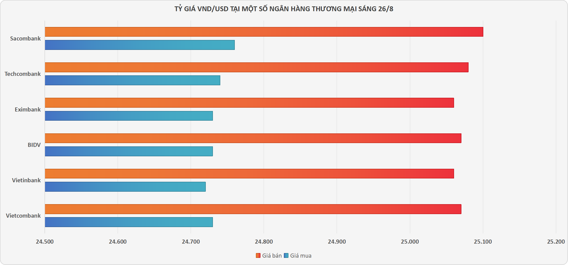 Techcombank đang niêm yết USD ở mức 24.740 - 25.080 VND/USD, giảm 110 đồng ở cả hai chiều mua - bán so với phiên liền trước. Trong khi Sacombank đang niêm yết USD ở mức 24.760 - 25.100 VND/USD, giảm 40 đồng ở chiều mua và 70 đồng ở chiều bán so với phiên khảo sát liền trước.