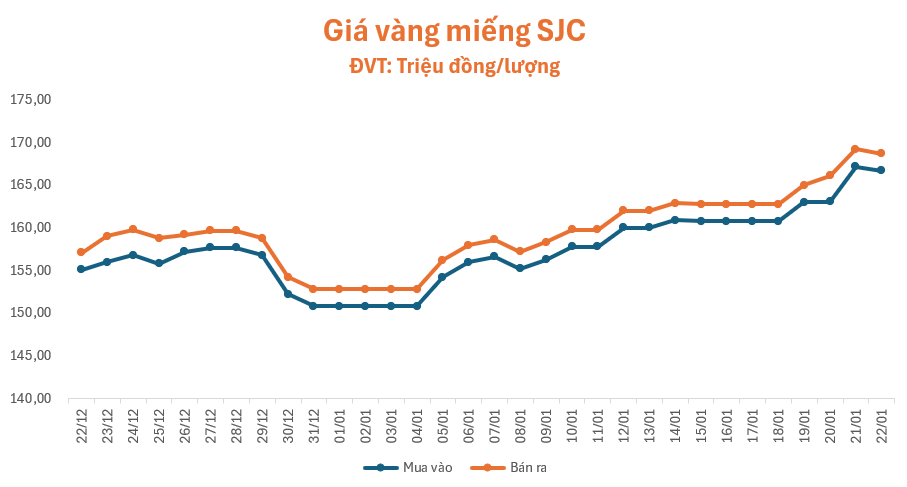 Phiên giao dịch sáng nay (22/01), lúc 09 giờ 30 phút, giá vàng miếng SJC ở hầu hết các cửa hàng lớn như Bảo Tín Minh Châu, Doji và PNJ đều giảm mạnh so với giá khảo sát sáng qua, giao dịch quanh mức 166,7 – 168,7 triệu đồng/lượng (mua – bán), giảm 1,3 triệu đồng/lượng ở cả chiều mua và chiều bán, chênh lệch hai chiều duy trì ở ngưỡng 2 triệu đồng/lượng.