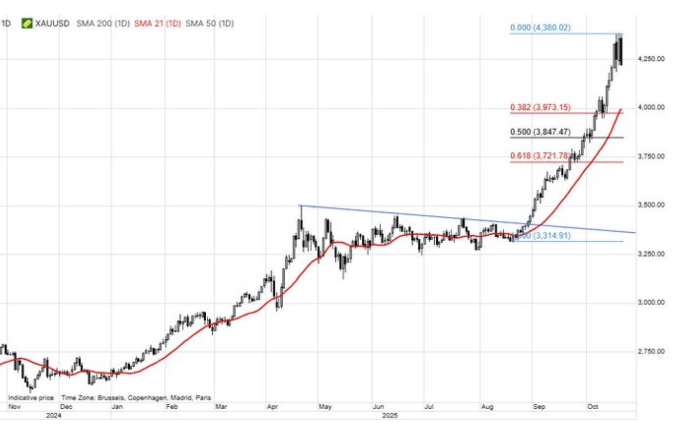 Giá vàng giao ngay trên thị trường quốc tế vào lúc 15h00 ngày 21/10, được ghi nhận giao dịch quanh mức 4.110 USD một ounce, giảm hơn 5,5% so với mức giá mở cửa ngày 20/10. Tuy nhiên, giá mới chỉ giảm xuống mức thấp nhất trong bốn ngày và vẫn tăng hơn 56% kể từ đầu năm đến nay.