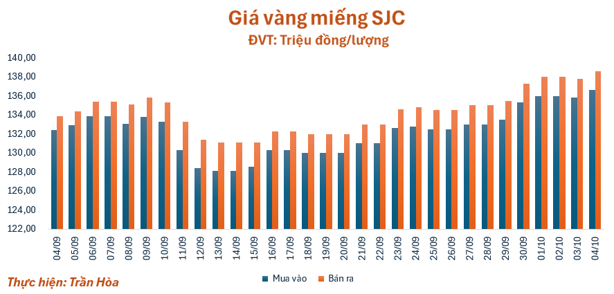 Đầu phiên giao dịch cuối tuần (04/10), giá vàng miếng SJC lập đỉnh kỷ lục mới, đang niêm yết ở mốc 136,6 – 138,6 triệu đồng/lượng, tăng 0,8 triệu đồng/lượng ở cả chiều mua và bán ra so với giá khảo sát sáng qua. Chênh lệch giá mua vào – bán ra ở ngưỡng 2 triệu đồng/lượng.