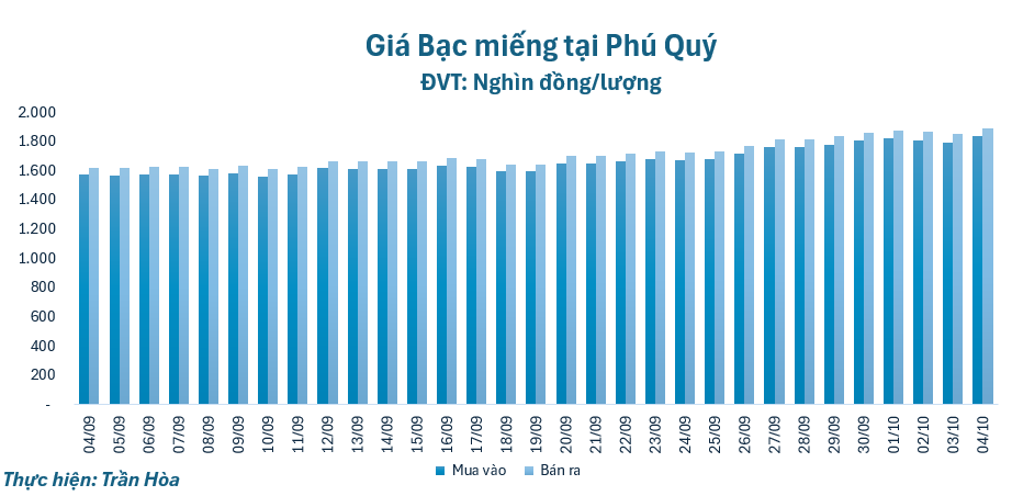 Giá bạc sáng 4/10 đồng loạt tăng mạnh. Tại Phú Quý, giá bạc tăng 42.000 đồng chiều mua và 43.000 đồng chiều bán, đạt mốc 1.837.000 – 1.894.000 đồng/lượng. Giá bạc miếng 1kg vượt ngưỡng 50 triệu đồng, hiện đang niêm yết ở mốc 50,5 triệu đồng/kg.