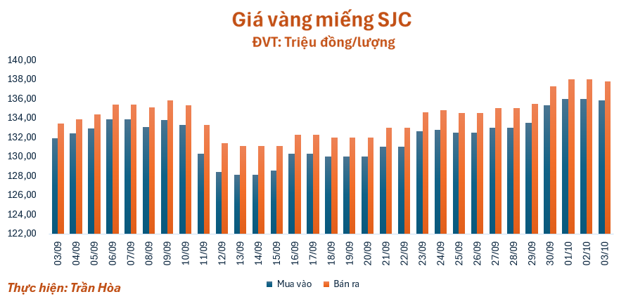 Đầu phiên giao dịch sáng nay (3/10), giá vàng miếng SJC tiếp tục được điều chỉnh giảm phiên thứ 2 liên tiếp sau khi vượt lên trên 138 triệu/lượng cùng thông tin Chính phủ Mỹ đóng cửa, hiện đang niêm yết ở mức 135,8 – 137,8 triệu đồng/lượng, giảm 0,2 triệu đồng/lượng. Chênh lệch giá mua vào - bán ra ở ngưỡng 2 triệu đồng/lượng.