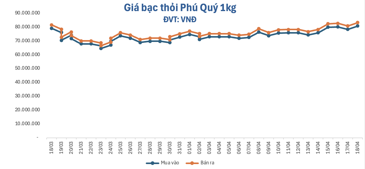 Giá bạc thỏi 1kg tăng hơn gần 3.000.000 đồng, giao dịch trên mốc 83.000.000 đồng/kg, đạt mức 80.906.464 – 83.413.125 đồng/kg (mua – bán), tăng 2.453.327 đồng ở chiều mua và tăng 2.533.327 đồng ở chiều bán.