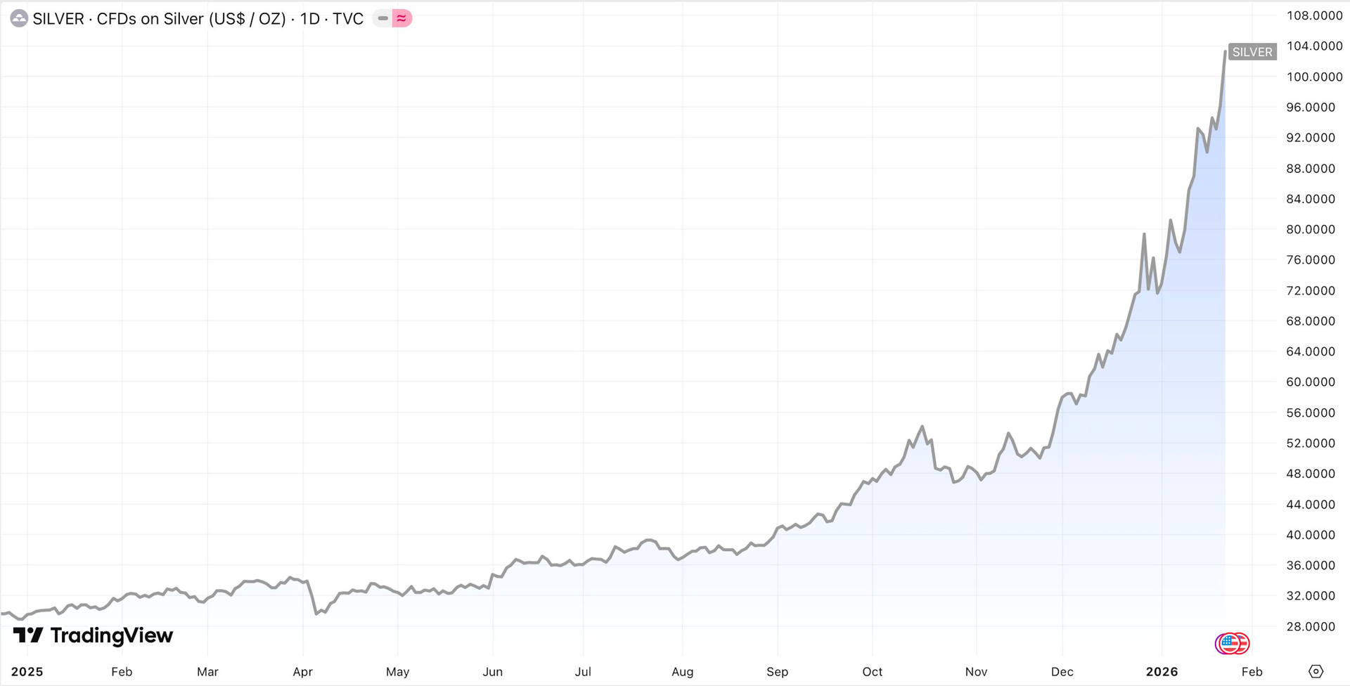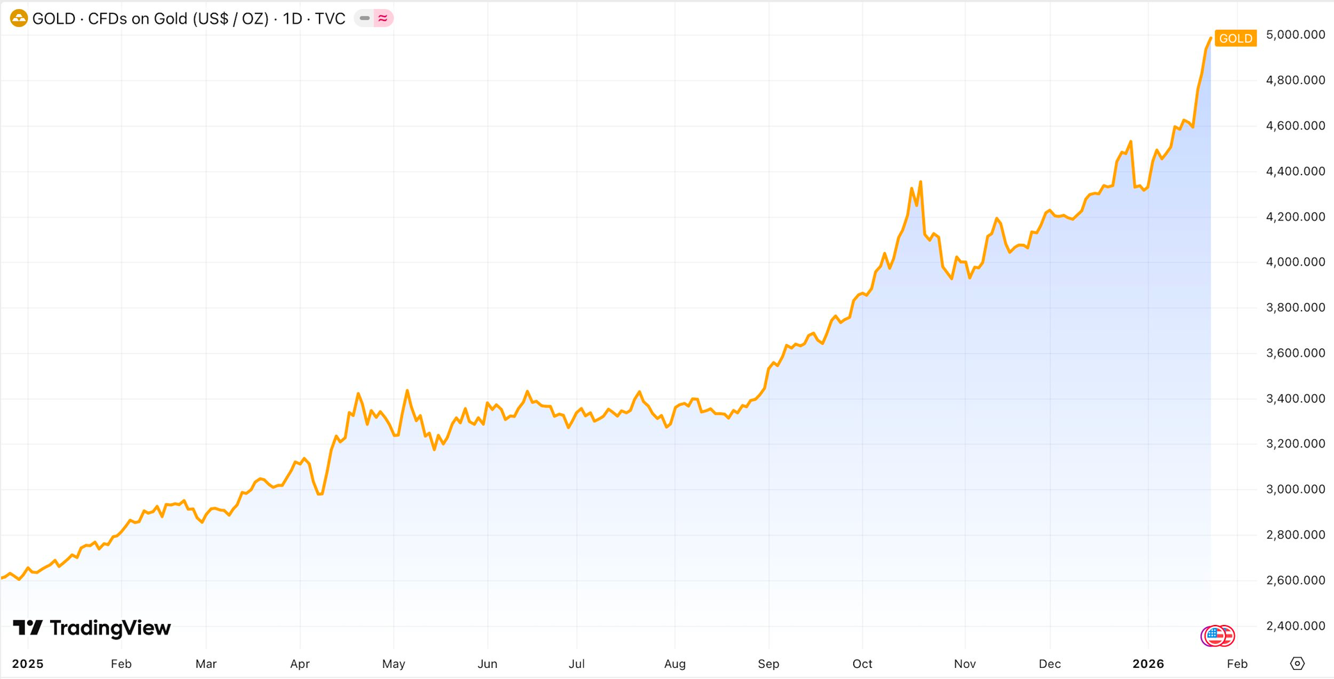 Thị trường kim loại quý toàn cầu đang trải qua một trong những giai đoạn bùng nổ mạnh nhất nhiều thập kỷ trở lại đây. Giá vàng liên tiếp phá đỉnh lịch sử, qua đó tiến rất gần đến mốc 5.000 USD/oz. Bạc thậm chí còn dữ dội hơn với mức tăng 44% từ đầu năm 2026, vượt 100 USD/oz lần đầu trong lịch sử.
