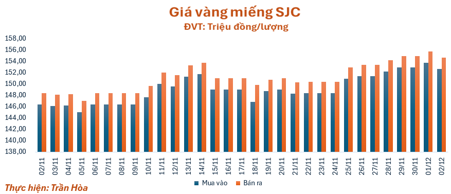 Đầu phiên giao dịch sáng nay (2/12), lúc 10 giờ giá vàng miếng SJC tiếp tục được điều chỉnh giảm hơn 1 triệu đồng/lượng so với giá khảo sát sáng qua, quanh mốc 152,6 – 154,6 triệu đồng/lượng (mua – bán), giảm 1,1 triệu đồng/lượng ở chiều mua và chiều bán. Chênh lệch giá mua vào - bán ra ở ngưỡng 2 triệu đồng/lượng.