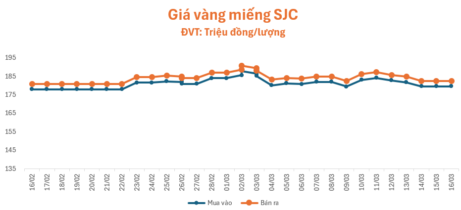 Giá vàng tạm đứng yên phiên giao dịch sáng đầu tuần (16/3). Lúc 9 giờ 20 phút, giá vàng miếng SJC tại cửa hàng SJC, Phú Quý, Bảo Tín Minh Châu, PNJ và Doji đều niêm yết ở mức 179,6 – 182,6 triệu đồng/lượng (mua – bán), đi ngang so với giá cuối tuần trước, chênh lệch mua – bán ở mức 3 triệu đồng/lượng.