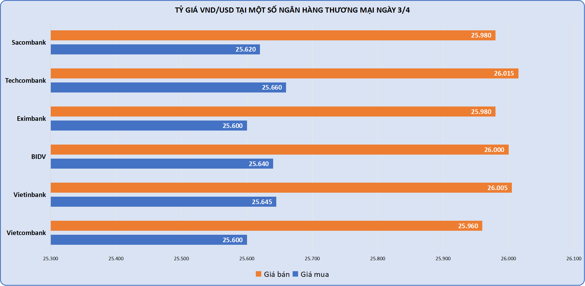 Tại Techcombank, giá USD điều chỉnh tăng 180 đồng ở chiều mua và 190 đồng ở chiều bán, đang niêm yết ở mức 25.660 - 26.015 VND/USD. Trong khi Sacombank niêm yết USD ở mức 25.620 - 25.980 VND/USD, tăng 157 đồng ở mỗi chiều so với phiên trước đó.