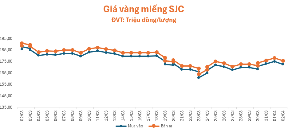 Giá vàng đảo chiều giảm sâu trong phiên sáng nay (2/4), lúc 9 giờ, giá vàng miếng SJC tại cửa hàng SJC, Phú Quý, Bảo Tín Minh Châu, PNJ và Doji đồng loạt niêm yết ở mức 172,5 – 175,5 triệu đồng/lượng (mua – bán), giảm 2,5 triệu đồng/lượng ở cả chiều mua và chiều bán so với giá khảo sát sáng qua, chênh lệch mua – bán ở mức 3 triệu đồng/lượng.