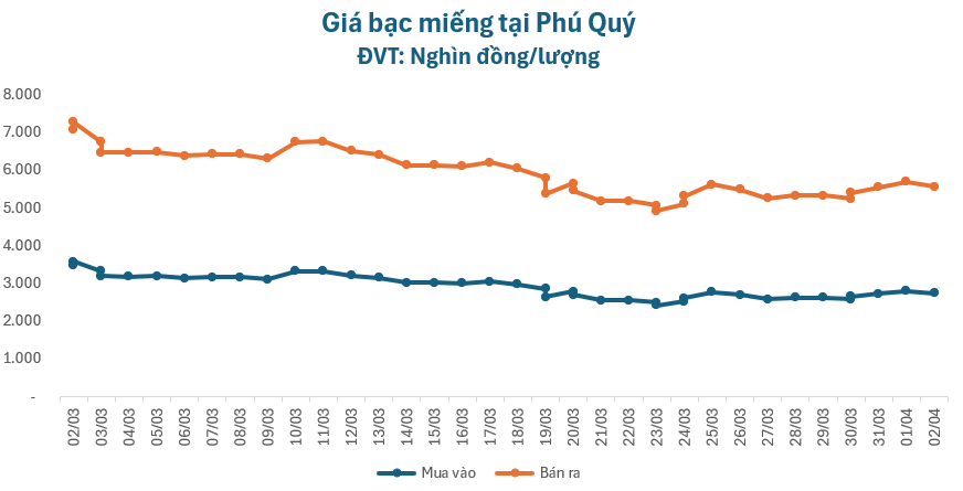 Giá bạc giao ngay tăng mạnh nhưng giảm 20,4% so với đầu tháng 3.
