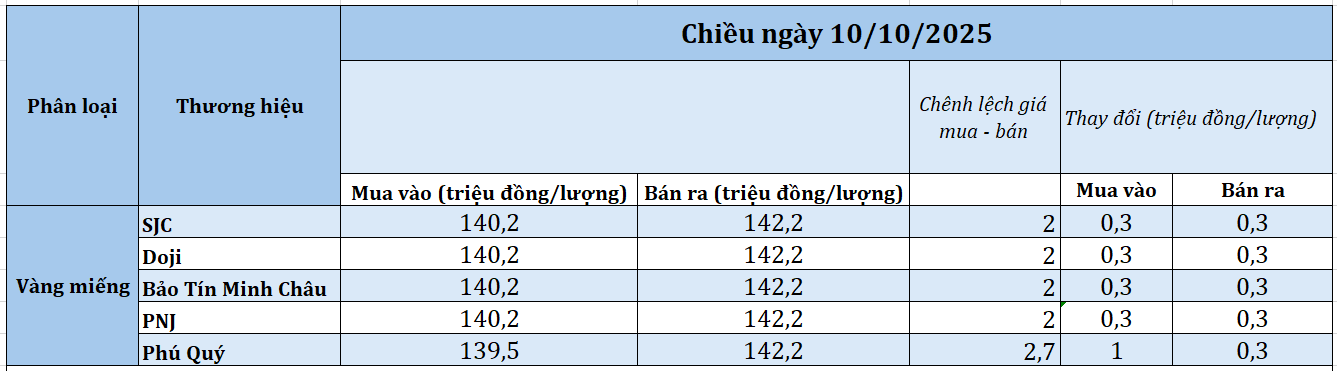 Cuối phiên giao dịch chiều hôm nay (10/10), sau khi giảm mạnh vào buổi sáng, giá vàng SJC đã bật trở lại trong phiên chiều, tăng 0,3 triệu đồng/lượng cả hai chiều, hiện đang quanh mốc 140,2 – 142,2 triệu đồng/lượng, chênh lệch giá mua vào - bán ra ở ngưỡng 2 triệu đồng/lượng.