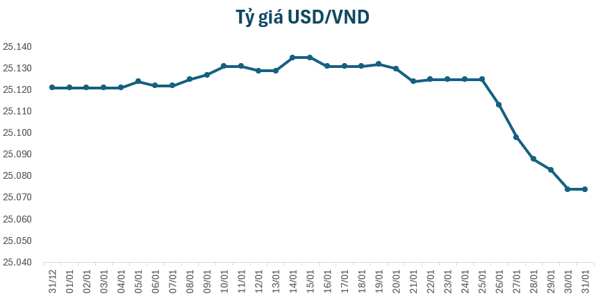 Vào sáng nay, tỷ giá trung tâm đang giao dịch ở mốc 25.074 VND/USD, đi ngang so với giá khảo sát sáng qua. Tỷ giá USD bắt đầu giảm mạnh từ ngày 25/1, đã giảm 47 đồng trong tháng qua.