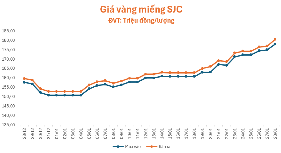 Phiên giao dịch sáng nay (28/01), lúc 09 giờ, giá vàng miếng ở hầu hết các cửa hàng lớn như SJC, Doji và PNJ đều duy trì đà tăng, niêm yết ở mức 178,1 – 180,6 triệu đồng/lượng (mua – bán), tăng 3,1 triệu đồng/lượng ở chiều mua và tăng 3,6 triệu đồng/lượng ở chiều bán so với sáng hôm qua, chênh lệch hai chiều duy trì ở ngưỡng 2 triệu đồng/lượng.