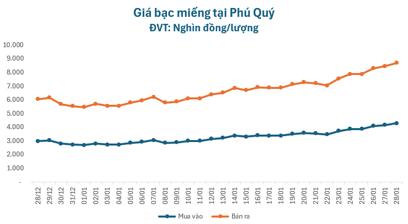 Giá bạc đã tăng gần 59% từ đầu năm đến nay, khiến người mua bạc lãi đậm gần 43.000.000 đồng mỗi kg (giá bạc bán ra ngày 1/1/2026 là 74.000.000 đồng/kg).