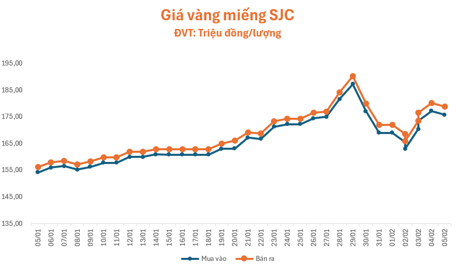 Phiên giao dịch sáng nay (05/02), giá vàng quay đầu giảm. Lúc 09 giờ 30 phút, giá vàng miếng SJC ở hầu hết các cửa hàng lớn như Phú Quý, Bảo Tín Minh Châu, Doji và PNJ đồng loạt giảm, niêm yết ở mức 175,8 – 178,8 triệu đồng/lượng (mua – bán), giảm 1,4 triệu đồng/lượng ở chiều mua và chiều bán so với giá khảo sát sáng qua, chênh lệch hai chiều tăng lên ngưỡng 3 triệu đồng/lượng.