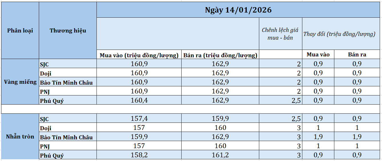 Phiên giao dịch sáng nay (14/1), lúc 09 giờ 30 phút, giá vàng miếng tại các thương hiệu lớn như SJC, Bảo Tín Minh Châu, DOJI và PNJ đồng loạt tăng 0,9 triệu đồng/lượng so với giá khảo sát sáng qua. Hiện giá vàng miếng được niêm yết ở mức 160,9 – 162,9 triệu đồng/lượng (mua – bán).