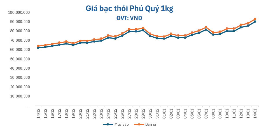 Giá bạc thỏi 1kg lập đỉnh kỷ lục, tiến sát mốc 93.000.000 đồng/kg, giao dịch ở mức 90.079.775 – 92.853.101 đồng/kg (mua – bán), tăng 4.346.656 đồng ở chiều mua và tăng 4.479.989 đồng ở chiều bán.