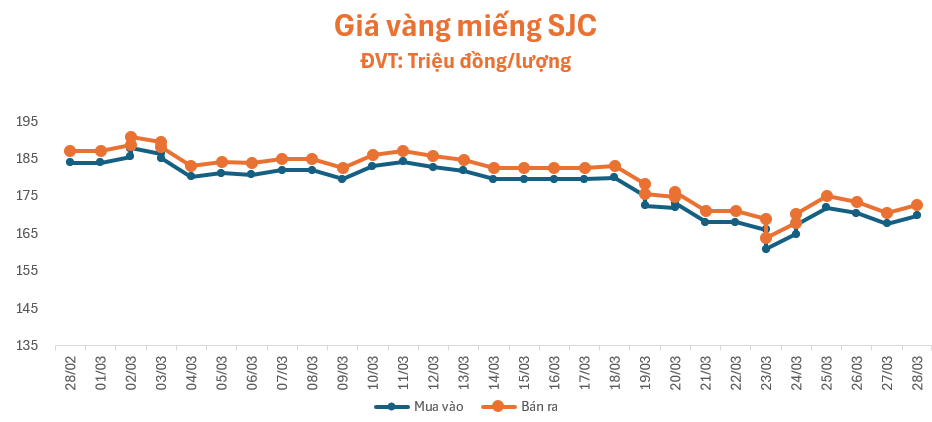 Giá vàng quay đầu đi lên trong phiên giao dịch cuối tuần (28/3), giá vàng miếng SJC tại cửa hàng SJC, Bảo Tín Minh Châu, Phú Quý, PNJ và Doji đồng loạt niêm yết ở mức 169,8 – 172,8 triệu đồng/lượng (mua – bán), giảm 4,4 triệu đồng/lượng ở cả chiều mua và chiều bán so với giá khảo sát sáng qua, chênh lệch mua – bán ở mức 3 triệu đồng/lượng.