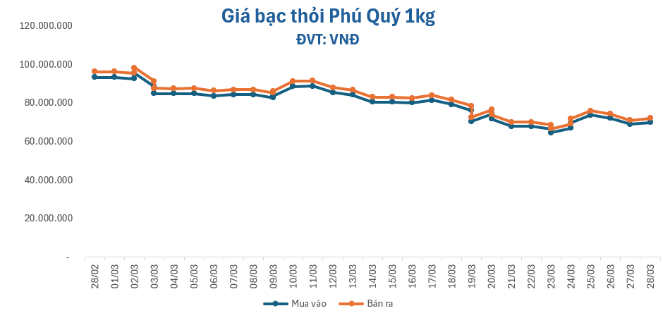 Giá bạc liên tiếp giảm, tính từ đầu tháng 3 đến nay, người mua bạc đã lỗ tới hơn 24.000.000 đồng/kg, tương đương với giảm hơn 25%.