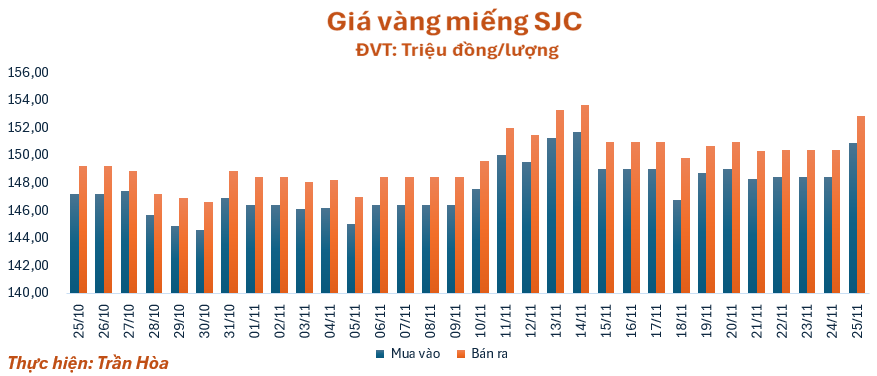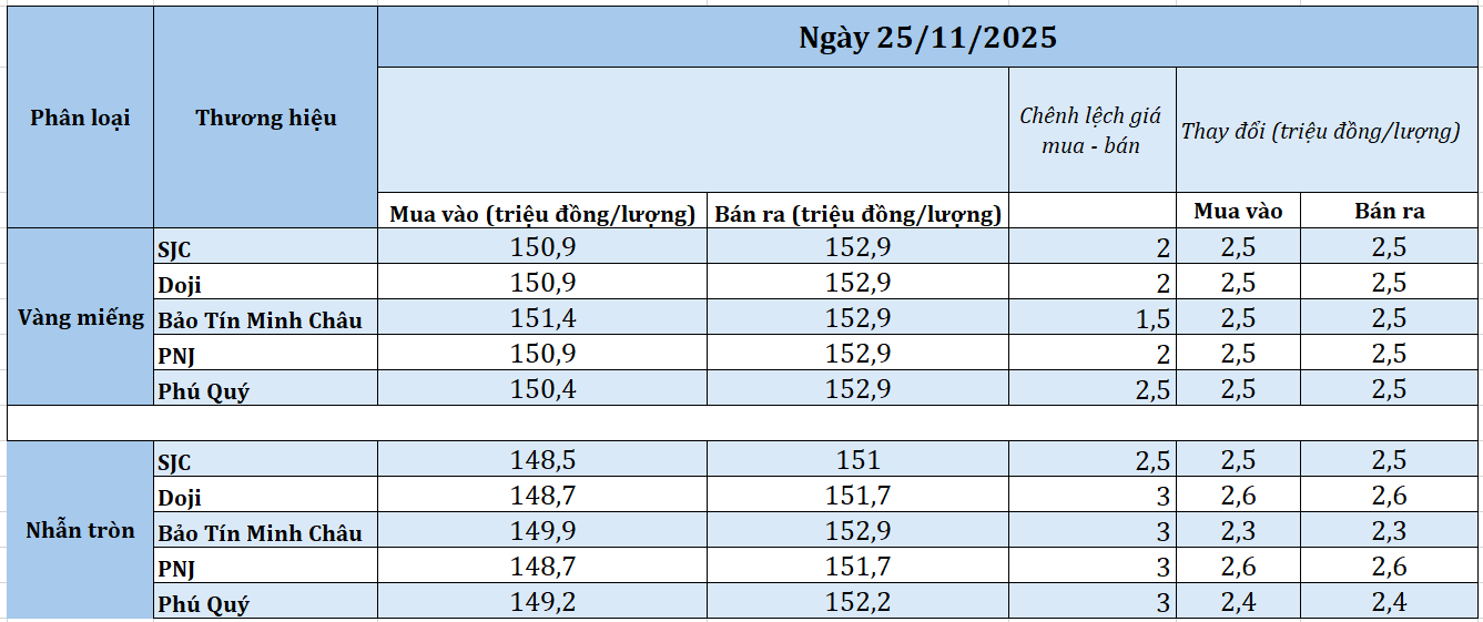Vào sáng nay (25/11), giá vàng miếng SJC tăng tới 2,5 triệu đồng/lượng so với giá khảo sát sáng qua, quanh mốc 150,9 – 152,9 triệu đồng/lượng (mua – bán). Chênh lệch giá mua vào - bán ra ở ngưỡng 2 triệu đồng/lượng.