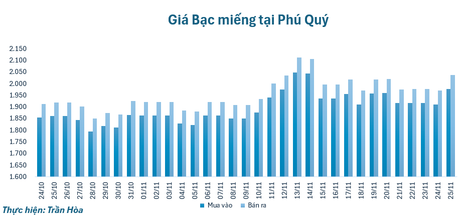 Giá bạc sáng 25/11 được điều chỉnh tăng, tại Phú Quý, giá bạc miếng niêm yết ở mốc 1.977.000 – 2.038.000 đồng/lượng, tăng 65.000 đồng ở chiều mua và tăng 67.000 đồng chiều bán so với cùng thời điểm ngày hôm qua.