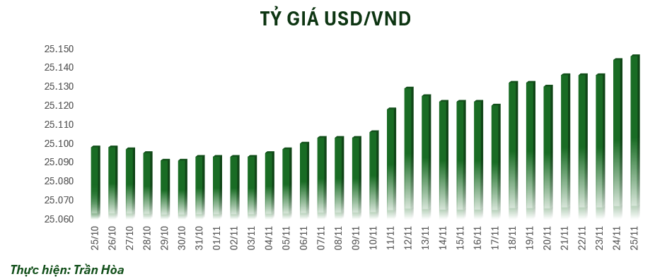 Vào sáng nay, tỷ giá trung tâm đang được niêm yết ở mốc 25.146 VND/USD, tăng 2 đồng so với mốc khảo sát sáng qua. Tại một số ngân hàng thương mại, giá USD cũng đồng loạt tăng theo tỷ giá trung tâm.