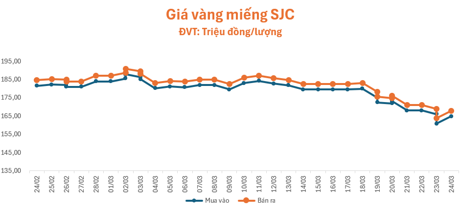 Trước khi tăng trở lại, giá vàng đã giảm mạnh nhất vào thứ Hai, cũng là phiên giảm thứ 8 liên tiếp và đã xuống tới 20 triệu đồng/lượng diễn ra trong khoảng thời gian từ ngày18/3 đến ngày 23/3.