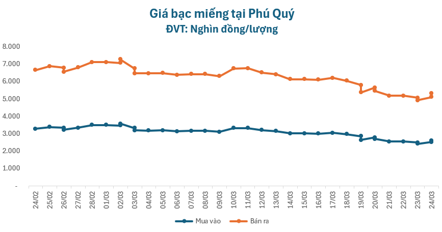 Cùng thời điểm, giá bạc tiếp đà đi lên, tại Phú Quý, giá bạc miếng niêm yết ở mức 2.617.000 – 2.698.000 đồng/lượng, tăng 101.000 đồng ở chiều mua và tăng 104.000 đồng ở chiều bán so với khảo sát sáng nay.