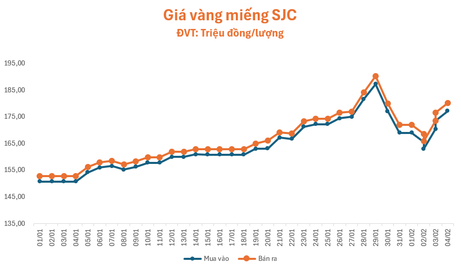 Phiên giao dịch sáng nay (04/02), lúc 10 giờ, giá vàng miếng SJC ở hầu hết các cửa hàng lớn như Phú Quý, Bảo Tín Minh Châu, Doji và PNJ đều tiếp đà tăng mạnh, niêm yết ở mức 177,2 – 180,2 triệu đồng/lượng (mua – bán), tăng 3,7 triệu đồng/lượng ở chiều mua và chiều bán so với chiều hôm qua, chênh lệch hai chiều tăng lên ngưỡng 3 triệu đồng/lượng.
