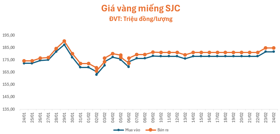 Phiên giao dịch sáng nay (24/02), lúc 10 giờ, giá vàng miếng SJC tại cửa hàng SJC, Phú Quý, Bảo Tín Minh Châu, PNJ và Doji đều niêm yết ở mức 181,6 – 184,6 triệu đồng/lượng (mua – bán), đi ngang so với giá khảo sát sáng qua, chênh lệch mua – bán ở ngưỡng 3 triệu đồng/lượng.
