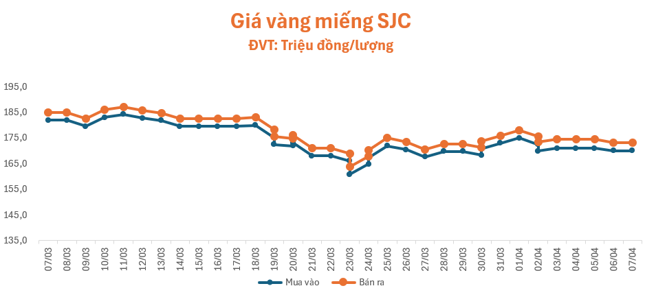 Tại Doji giảm 0,2 triệu đồng/lượng ở chiều mua vào và giảm 0,1 triệu đồng/lượng ở chiều bán ra, lùi về mức 169,9 – 173 triệu đồng/lượng (mua – bán).