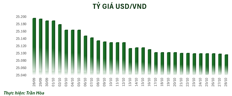Tại Eximbank giữ nguyên chiều mua và giảm 2 đồng chiều bán, đạt mốc 26.090 – 26.349 VND/USD. Techcombank cũng không thay đổi chiều mua và giảm 2 đồng chiều bán, niêm yết ở mốc 26.106 – 26.349 VND/USD. Tại Sacombank giảm 40 đồng chiều mua, quanh mốc 26.110 – 26.349 VND/USD.