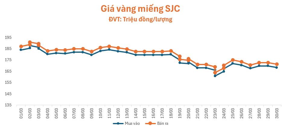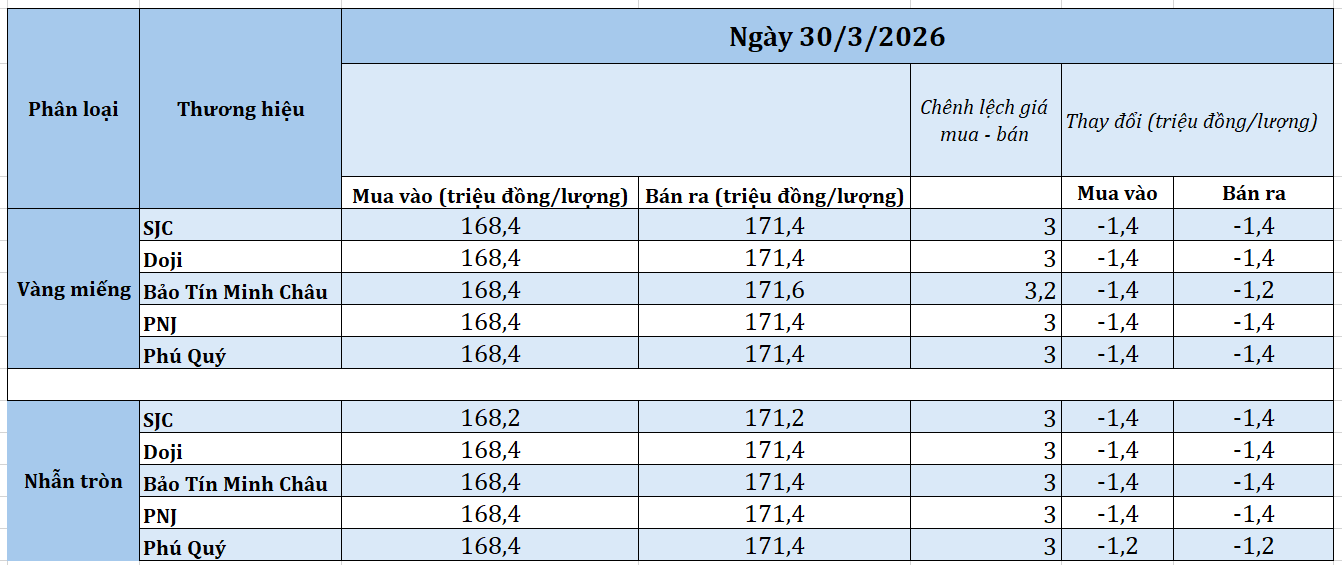 Giá vàng đảo chiều đi xuống trong phiên giao dịch đầu tuần (30/3), lúc 9 giờ, giá vàng miếng SJC tại cửa hàng SJC, Phú Quý, PNJ và Doji đồng loạt niêm yết ở mức 168,4 – 171,4 triệu đồng/lượng (mua – bán), giảm 1,4 triệu đồng/lượng ở cả chiều mua và chiều bán so với giá cuối tuần trước, chênh lệch mua – bán ở mức 3 triệu đồng/lượng.