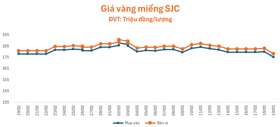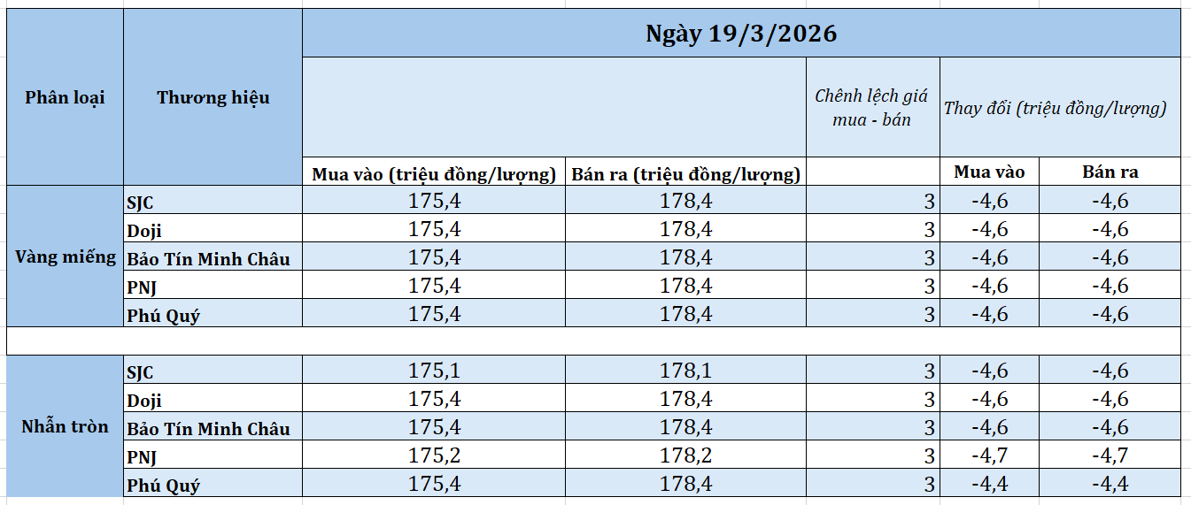Giá vàng bất ngờ giảm mạnh phiên giao dịch sáng nay (19/3). Lúc 9 giờ 10 phút, giá vàng miếng SJC tại cửa hàng SJC, Phú Quý, Bảo Tín Minh Châu, PNJ và Doji đồng loạt niêm yết ở mức 175,4 – 178,4 triệu đồng/lượng (mua – báng), giảm 4,6 triệu đồng/lượng ở cả chiều mua và chiều bán so với giá khảo sát sáng qua, chênh lệch mua – bán ở mức 3 triệu đồng/lượng.