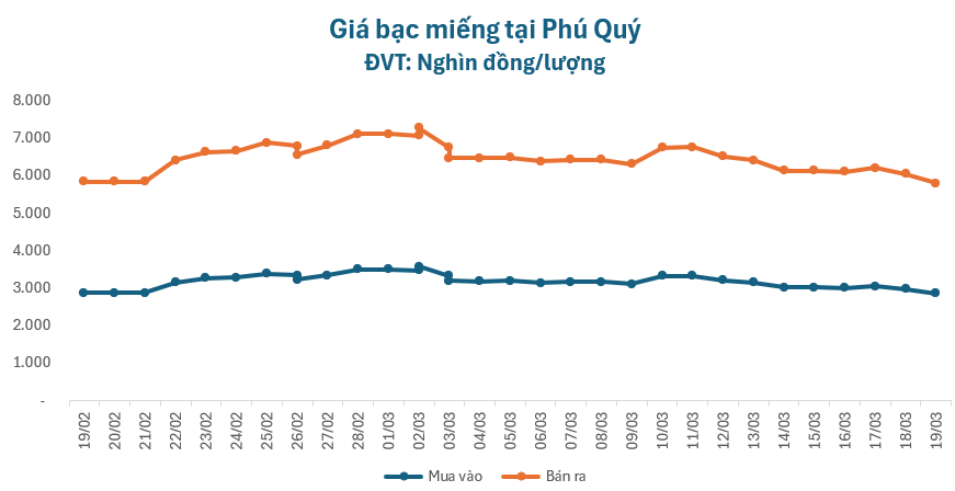 Giá bạc tiếp đà đi xuống, tại Phú Quý, giá bạc miếng niêm yết ở mức 2.857.000 – 2.945.000 đồng/lượng, giảm 116.000 đồng chiều mua và giảm 120.000 đồng chiều bán so với giá sáng qua.