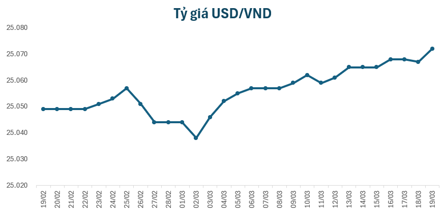 Vào sáng nay, tỷ giá trung tâm đứng ở mức 25.072 VND/USD, tăng 5 đồng so với giá khảo sát sáng qua. Tại một số ngân hàng thương mại, giá USD hầu như cũng được điều chỉnh tăng.