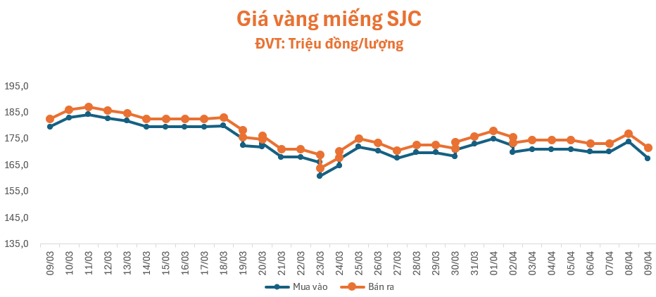 Giá vàng quay đầu lao dốc trong phiên giao dịch sáng nay (9/4), lúc 9 giờ 5 phút, giá vàng miếng SJC tại cửa hàng SJC, Bảo Tín Minh Châu, PNJ và Doji đều niêm yết ở mức 167,5 – 171,5 triệu đồng/lượng (mua – bán), giảm 6,5 triệu đồng/lượng ở chiều mua và giảm 5,5 triệu đồng/lượng ở chiều bán so với giá khảo sát sáng qua, chênh lệch mua – bán đạt mức 4 triệu đồng/lượng.
