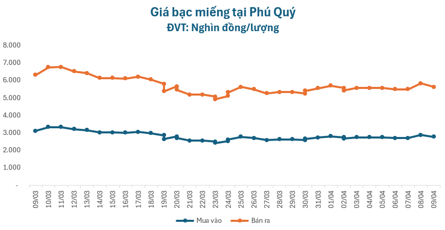 Tại Doji, giá bạc miếng giảm 123.000 đồng/lượng chiều mua và giảm 101.000 đồng/lượng ở chiều bán, quanh mức 2.755.000 – 2.876.000 đồng/lượng (mua – bán).
